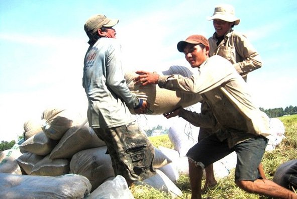 Farmers carry a bag of paddy (unhusked rice) at their farm in Tien Giang Province – PHOTO: TRUNG CHANH