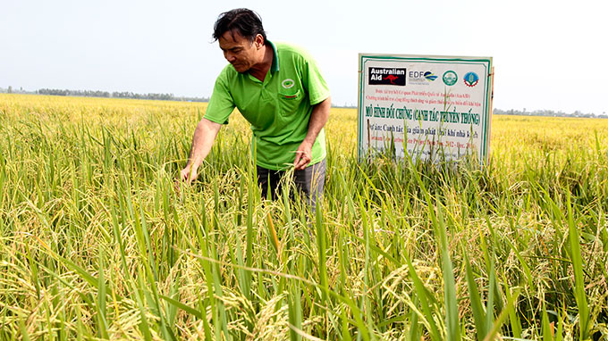 Những ngày cuối tháng 6-2014 là thời điểm người dân tại HTX Kênh 7B (xã Đông Thạnh A, huyện Tân Hiệp) và HTX Thới Thượng (huyện Phú Tân) hối hả thu hoạch vụ lúa hè thu. Đây là vụ mùa thứ năm mà người dân tham gia dự án. Ông Võ Minh Chiếu (chủ nhiệm HTX Kênh 7B) chỉ cánh đồng hơn 10ha sắp thu hoạch cho biết qua năm vụ canh tác với sự trợ giúp, tập huấn kỹ thuật của cán bộ EDF và Đại học Cần Thơ, giá thành sản xuất cho mỗi công ruộng (1.000m²) ông tính toán được chỉ còn 1,2 triệu đồng, trong khi trước đây luôn ở mức 1,6-1,8 triệu đồng. Ông Chiếu nhớ lại vụ đầu tiên thực hiện theo mô hình này HTX của ông chỉ có khoảng 100 hộ tham gia, nhưng hiện nay có khoảng 220 hộ vì họ thấy được lợi ích của mô hình. “Trước đây tôi là một nông dân giỏi, nhưng là giỏi… xịt thuốc trừ sâu, còn bây giờ đã khác rồi. Đặc biệt với sự hướng dẫn của nhà khoa học, khi nào cần thiết thì đưa nước vào, khi không cần thiết thì rút nước ra (kỹ thuật ngập khô xen kẽ) chứ không để nước ngập ruộng quanh năm như trước đây nên thân lúa rất chắc, không ngã đổ đã làm giảm thất thoát trong thu hoạch” – ông Chiếu cho hay.
